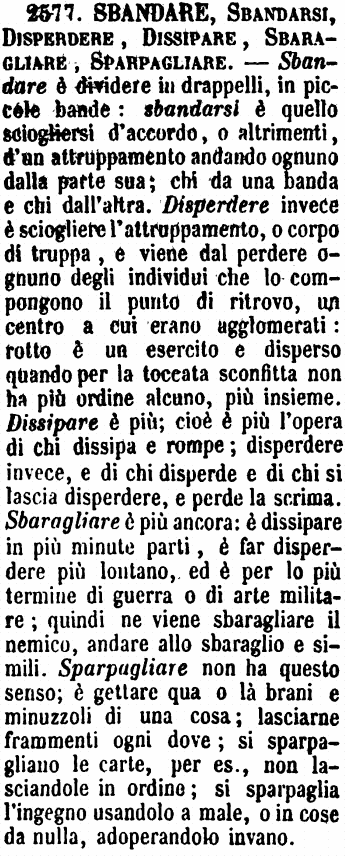 | Sbandare, Sbandarsi, Disperdere, Dissipare, Sbaragliare, Sparpagliare - Sbandare è dividere in drappelli, in piccole bande: sbandarsi è quello sciogliersi d'accordo, o altrimenti, d'un attruppamento andando ognuno dalla parte sua; chi da una banda e chi dall'altra. Disperdere invece è sciogliere l'attruppamento, o corpo di truppa, e viene dal perdere ognuno degli individui che lo compongono il punto di ritrovo, un centro a cui erano agglomerati: rotto è un esercito e disperso quando per la toccata sconfitta non ha più ordine alcuno, più insieme. Dissipare è più; cioè è più l'opera di chi dissipa e rompe; disperdere invece, e di chi disperde e di chi si lascia disperdere, e perde la scrima. Sbaragliare è più ancora: è dissipare in più minute parti, è far disperdere più lontano, ed è per lo più termine di guerra o di arte militare; quindi ne viene sbaragliare il nemico, andare allo sbaraglio e simili. Sparpagliare non ha questo senso; è gettare qua o là brani e minuzzoli di una cosa; lasciarne frammenti ogni dove; si sparpagliano le carte, per es., non lasciandole in ordine; si sparpaglia l'ingegno usandolo a male, o in cose da nulla, adoperandolo invano. [immagine] |