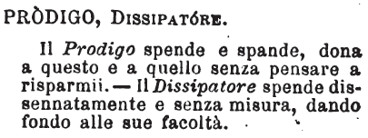 | Prodigo, Dissipatore - Il Prodigo spende e spande, dona a questo e a quello senza pensare a risparmii. - Il Dissipatore spende dissennatamente e senza misura, dando fondo alle sue facoltà. [immagine] |