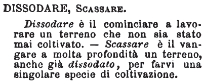 | Dissodare, Scassare - Dissodare è il cominciare a lavorare un terreno che non sia stato mai coltivato. - Scassare è il vangare a molta profondità un terreno, anche già dissodato, per farvi una singolare specie di coltivazione. [immagine] |