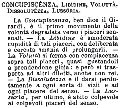 | Concupiscenza, Libidine, Voluttà, Dissolutezza, Lussuria - La Concupiscenza, ben dice il Girardi, è il primo movimento della volontà degradata verso i piaceri sensuali. - La Libidine è smoderata cupidità di tali piaceri, con deliberata e cercata smania di prolungarli. - La Voluttà si ferma con compiacenza sopra tali piaceri, quasi gustandoli e prendendone gioja: e però si trasporta ad altri diletti, anche non rei. - La Dissolutezza è il darsi perdutamente a ogni sorta di vizii e ad ogni piacere del senso. - La Lussuria, per ultimo, è abito colpevole ai colpevoli piaceri del senso. [immagine] |