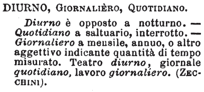 | Diurno, Giornaliero, Quotidiano - Diurno è opposto a notturno. - Quotidiano a saltuario, interrotto. - Giornaliero a mensile, annuo, o altro aggettivo indicante quantità di tempo misurato. Teatro diurno, giornale quotidiano, lavoro giornaliero. (Zecchini). [immagine] |
