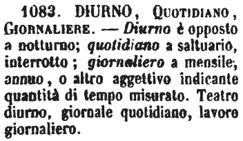 | Diurno, Quotidiano, Giornaliere - Diurno è opposto a notturno; quotidiano a saltuario, interrotto; giornaliero a mensile, annuo, o altro aggettivo indicante quantità di tempo misurato. Teatro diurno, giornale quotidiano, lavoro giornaliero. [immagine] |