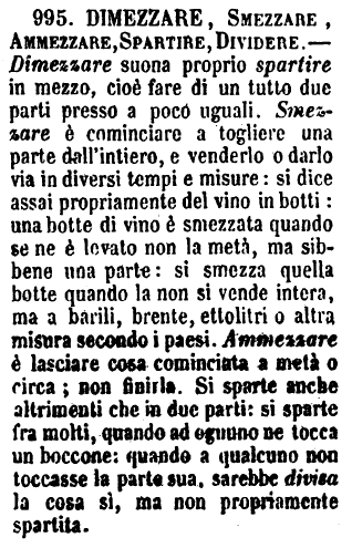 | Dimezzare, Smezzare, Ammezzare, Spartire, Dividere - Dimezzare suona proprio spartire in mezzo, cioè fare di un tutto due parti presso a poco uguali. Smezzare è cominciare a togliere una parte dall'intiero, e venderlo o darlo via in diversi tempi e misure: si dice assai propriamente del vino in botti: una botte di vino è smezzata quando se ne è levato non la metà, ma sibbene una parte: si smezza quella botte quando non la si vende intera, ma a barili, brente, ettolitri o altra misura secondo i paesi. Ammezzare è lasciare cosa cominciata a metà o circa; non finirla. Si sparte anche altrimenti che in due parti: si sparte fra molti, quando ad ognuno ne tocca un boccone: quando a qualcuno non toccasse la parte sua, sarebbe divisa la cosa sì, ma non propriamente spartita. [immagine] |