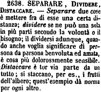 | Separare, Dividere, Distaccare - Separare due cose è mettere fra di esse una certa distanza; dividere se ne può una sola in più parti secondo la volontà o il bisogno; il dividersi adunque, quando anche voglia significare di persona da persona benvoluta ed amata, è cosa più dolorosamente sensibile. Distaccare è tor via parte da un tutto; si staccano, per es., i frutti dell'albero; quest'esempio dà norma per ogni altro. [immagine] |