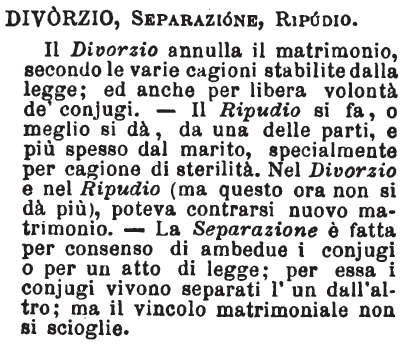 | Divorzio, Separazione, Ripudio - Il Divorzio annulla il matrimonio, secondo le varie cagioni stabilite dalla legge; ed anche per libera volontà de' conjugi. - Il Ripudio si fa, o meglio si dà, da una delle parti, e più spesso dal marito, specialmente per cagione di sterilità. Nel Divorzio e nel Ripudio (ma questo ora non si dà più), poteva contrarsi nuovo matrimonio. - La Separazione è fatta per consenso di ambedue i conjugi o per un atto di legge; per essa i conjugi vivono separati l'un dall'altro; ma il vincolo matrimoniale non si scioglie. [immagine] |