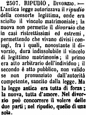 | Ripudio, Divorzio - L'antica legge autorizzava il ripudio della consorte legittima, onde era sciolto il vincolo matrimoniale; la nuova non permette il divorzio che in casi ristrettissimi ed estremi, permettendo che vivano divisi i coniugi, fra i quali, nonostante il divorzio, dura indissolubile il vincolo di legittimo matrimonio; il primo era atto arbitrario dell'individuo; il secondo è atto pubblico, non valido se non pronunziato dall'autorità competente, sancito dalla legge. Ma la legge antica era tutta di forza; la nuova, tutta d'amore. Nel divorzio può concorrere il volere delle due parti; nel ripudio, quello di una sola. [immagine] |