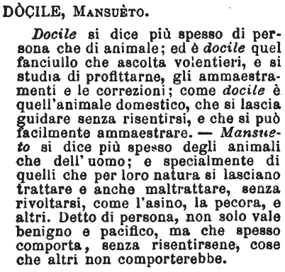 | Docile, Mansueto - Docile si dice più spesso di persona che di animale; ed è docile quel fanciullo che ascolta volentieri, e si studia di profittarne, gli ammaestramenti e le correzioni; come docile è quell'animale domestico, che si lascia guidare senza risentirsi, e che si può facilmente ammaestrare. - Mansueto si dice più spesso degli animali che dell'uomo; e specialmente di quelli che per loro natura si lasciano trattare e anche maltrattare, senza rivoltarsi, come l'asino, la pecora, e altri. Detto di persona, non solo vale benigno e pacifico, ma che spesso comporta, senza risentirsene, cose che altri non comporterebbe. [immagine] |