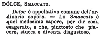 | Dolce, Smaccato - Dolce è appellativo comune dell'ordinario sapore. - Lo Smaccato è quel medesimo sapore, per dir così, esagerato, e che, piuttosto che piacere, stucca e diventa disgustoso. [immagine] |