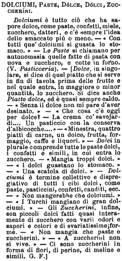 | Dolciumi, Paste, Dolce, Dolci, Zuccherini - Dolciumi è tutto ciò che ha sapore dolce, come paste, confetti, miele, zucchero, datteri, e c'è sempre l'idea dello smaccato più o meno. - «Con tutti que' dolciumi si guasta lo stomaco.» - Le Paste si chiamano per antonomasia quelle fatte di pasta con uova e zucchero, e cotte in forno. (V. Pasticceria). - [Dolce, in singolare, si dice di quel piatto che si serve in fin di tavola prima delle frutte e nel quale entra, in maggiore o minor quantità, lo zucchero. Si dice anche Piatto dolce, ed è quasi sempre caldo. - «Senza il dolce non mi pare d'aver desinato.» - «Che cosa c'è oggi per dolce? - La crema co' savojardi... Un pasticcio con la conserva d'albicocche...» - «Minestra, quattro piatti di carne, un dolce, frutta, formaggio, caffè e liquori.» - Dolci in plurale comprende tutte le paste dolci, i confetti e simili, in cui entra lo zucchero. - «Mangia troppi dolci.» - «I dolci guastano lo stomaco.» - «Una scatola di dolci.» - Dolciumi è termine collettivo e dispregiativo di tutti i cibi dolci, come paste, pasticcini, confetti, canditi, ecc. - «Non mangerebbe che dolciumi.» - «I Turchi mangiano di gran dolciumi.» - Gli Zuccherini, infine, son piccoli dolci fatti quasi interamente di zucchero con varii odori e sapori e colori e di svariatissime forme. - «Non mangia che paste e zuccherini.» - «A zuccherini non si vive.» - Ci sono zuccherini in forma di fiori, di perine, di meline e simili. G. F.] [immagine] |