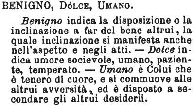 | Benigno, Dolce, Umano - Benigno indica la disposizione o la inclinazione a far del bene altrui, la quale inclinazione si manifesta anche nell'aspetto e negli atti. - Dolce indica umore socievole, umano, paziente, temperato. - Umano è colui che è tenero di cuore, e si commuove alle altrui avversità, ed è disposto a secondare gli altrui desiderii. [immagine] |