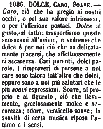 | Dolce, Caro, Soave - Caro, ciò che ha pregio ai nostri occhi, o pel suo valore intrinseco, o per l'affezione postaci. Dolce al gusto, al tatto: trasportiamo queste sensasioni all'animo, e vedremo che dolce è per noi ciò che sa delicatamente piacerci, che affettuosamente ci accarezza. Cari parenti, dolci parole. I rimproveri di persone a noi care sono talora tutt'altro che dolci, eppure sono a noi più salutari che le più soavi espressioni. Soave, al proprio e al figurato, ciò che lievemente, graziosamente molce e accarezza; odore, venticello soave; la soavità di certa musica riposa l'animo e i sensi. [immagine] |