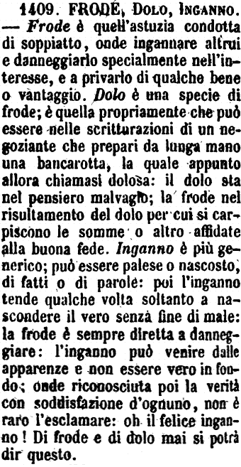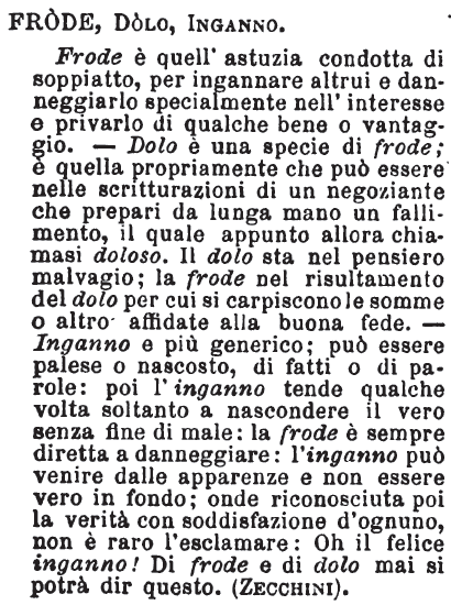 | Frode, Dolo, Inganno - Frode è quell'astuzia condotta di soppiatto, onde ingannare altrui e danneggiarlo specialmente nell'interesse, e a privarlo di qualche bene o vantaggio. Dolo è una specie di frode; è quella propriamente che può essere nelle scritturazioni di un negoziante che prepari da lunga mano una bancarotta, la quale appunto allora chiamasi dolosa: il dolo sta nel pensiero malvagio; la frode nel risultamento del dolo per cui si carpiscono le somme o altro affidate alla buona fede. Inganno è più generico; può essere palese o nascosto, di fatti o di parole: poi l'nganno tende qualche volta soltanto a nascondere il vero senza fine di male: la frode è sempre diretta a danneggiare: l'inganno può venire dalle apparenze e non essere vero in fondo; onde riconosciuta poi la verità con soddisfazione d'ognuno, non è raro l'esclamare: oh il felice inganno! Di frode e di dolo mai si potrà dir questo. [immagine] |
