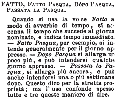 | Fatto, Fatto Pasqua, Dopo Pasqua, Passata la Pasqua - Quando si usa la voce Fatto a modo di avverbio di tempo, si accenna il tempo che succede al giorno nominato, e indica tempo immediato. - Fatto Pasqua, per esempio, si intende generalmente per il giorno appresso. - Dopo Pasqua si allarga un poco più, e può intendersi qualche giorno appresso. - Passata la Pasqua, si allarga più ancora, e può anche intendersi una o più settimane dopo. Questo dico per la stretta proprietà; ma l'uso confonde spesso tutte e tre queste maniere di dire. [immagine] |