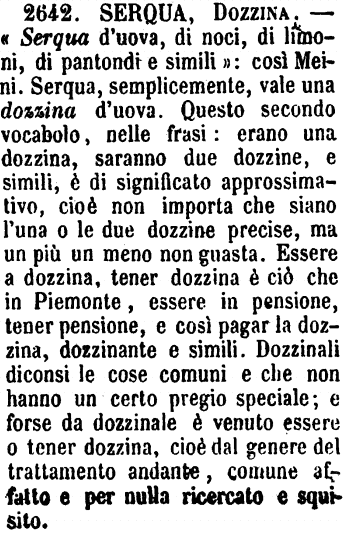 | Serqua, Dozzina - «Serqua d'uova, di noci, di limoni, di pantondi e simili»: così Meini. Serqua, semplicemente, vale una dozzina d'uova. Questo secondo vocabolo, nelle frasi: erano una dozzina, saranno due dozzine, e simili, è di significato approssimativo, cioè non importa che siano l'una o le due dozzine precise, ma un più un meno non guasta. Essere a dozzina, tener dozzina è ciò che in Piemonte, essere in pensione, tener pensione, e così pagar la dozzina, dozzinante e simili. Dozzinali diconsi le cose comuni e che non hanno un certo pregio speciale; e forse da dozzinale è venuto essere o tener dozzina, cioè dal genere del trattamento andante, comune affatto e per nulla ricercato e squisito. [immagine] |