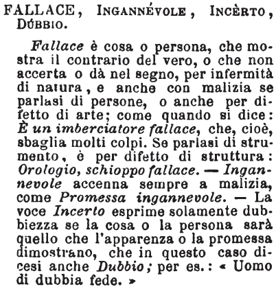 | Fallace, Ingannevole, Incerto, Dubbio - Fallace è cosa o persona, che mostra il contrario del vero, o che non accerta o dà nel segno, per infermità di natura, e anche con malizia se parlasi di persone, o anche per difetto di arte; come quando si dice: È un imberciatore fallace, che, cioè, sbaglia molti colpi. Se parlasi di strumento, è per difetto di struttura: Orologio, schioppo fallace. - Ingannevole accenna sempre a malizia, come Promessa ingannevole. - La voce Incerto esprime solamente dubbiezza se la cosa o la persona sarà quello che l'apparenza o la promessa dimostrano, che in questo caso dicesi anche Dubbio; per es.: « Uomo di dubbia fede. » [immagine] |