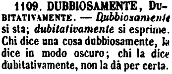 | Dubbiosamente, Dubitativamente - Dubbiosamente si sta; dubitativamente si esprime. Chi dice una cosa dubbiosamente, la dice in modo oscuro; chi la dice dubitativamente, non la dà per certa. [immagine] |