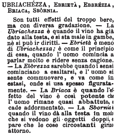 | Ubriachezza, Ebrietà, Ebbrezza, Briaca, Sbornia - Son tutti effetti del troppo bere, ma con diversa gradazione. - La Ubriachezza è quando il vino ha già dato alla testa, e si sta male in gambe, nè si può ir diritti. - Ebrietà è meno di Ubriachezza; è come il principio di essa, quando l'uomo comincia a parlar molto e ridere senza cagione. - La Ebbrezza sarebbe quando i sensi cominciano a esaltarsi, e l'uomo si sente commuovere, e va come in estasi, onde si usa spesso figuratamente. - La Briaca è quando l'effetto del vino è così potente che l'uomo rimane quasi abbattuto, e cade addormentato. - La Sbornia è quando il vino dà alla testa in modo che si vedono gli oggetti doppii, e pare che le cose circostanti girino attorno. [immagine] |