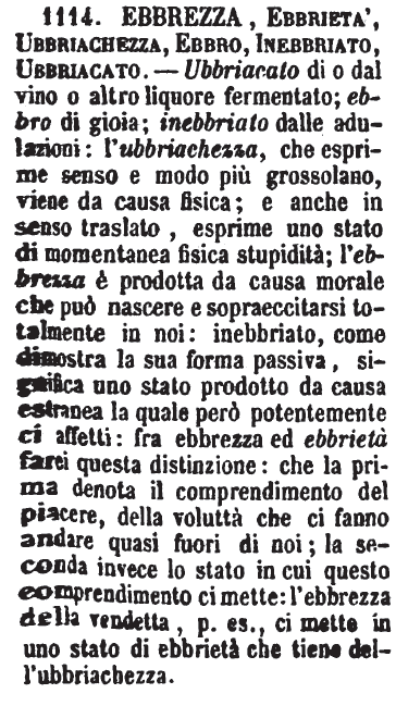 | Ebbrezza, Ebbrietà, Ubbriachezza, Ebbro, Inebbriato, Ubbriacato - Ubbriacato di o dal vino o altro liquore fermentato; ebbro di gioia; inebbriato dalle adulazioni: l'ubbriachezza, che esprime senso e modo più grossolano, viene da causa fisica; e anche in senso traslato, esprime uno stato di momentanea fisica stupidità; l'ebbrezza è prodotta da causa morale che può nascere e sopraeccitarsi totalmente in noi: inebbriato, come dimostra la sua forma passiva, significa uno stato prodotto da causa estranea la quale però potentemente ci affetti: fra ebbrezza ed ebbrietà farei questa distinzione: che la prima denota il comprendimento del piacere, della voluttà che ci fanno andare quasi fuori di noi; la seconda invece lo stato in cui questo comprendimento ci mette: l'ebbrezza della vendetta, p. es., ci mette in uno stato di ebbrietà che tiene dell'ubbriachezza. [immagine] |