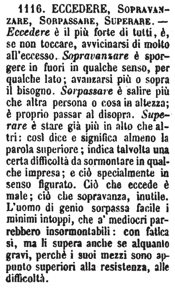 | Eccedere, Sopravanzare, Sorpassare, Superare - Eccedere è il più forte di tutti, è, se non toccare, avvicinarsi di molto all'eccesso. Sopravanzare è sporgere in fuori in qualche senso, per qualche lato; avanzarsi più o sopra il bisogno. Sorpassare è salire più che altra persona o cosa in altezza; è proprio passar al disopra. Superare è stare già più in alto che altri: così dice e significa almeno la parola superiore; indica talvolta una certa difficoltà da sormontare in qualche impresa; e ciò specialmente in senso figurato. Ciò che eccede è male; ciò che sopravanza, inutile. L'uomo di genio sorpassa facile i minimi intoppi, che a' mediocri parrebbero insormontabili: con fatica si, ma li supera anche se alquanto gravi, perchè i sui mezzi sono appunto superiori alla resistenza, alle difficoltà. [immagine] |