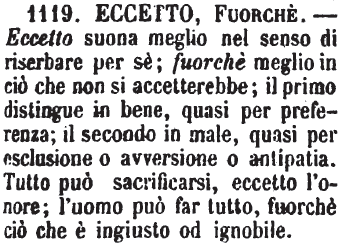 | Eccetto, Fuorchè - Eccetto suona meglio nel senso di riserbare per sè; fuorchè meglio in ciò che non si accetterebbe; il primo distingue in bene, quasi per preferenza; il secondo in male, quasi per esclusione o avversione o antipatia. Tutto può sacrificarsi, eccetto l'onore; l'uomo può far tutto, fuorchè ciò che è ingiusto od ignobile. [immagine] |