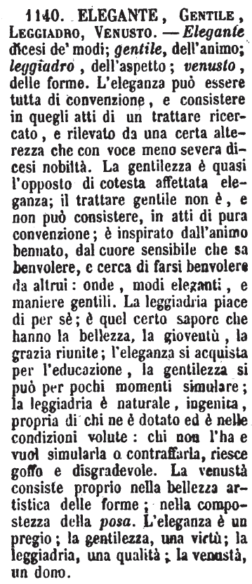 | Elegante, Gentile, Leggiadro, Venusto - Elegante dicesi de' modi; gentile, dell'animo; leggiadro, dell'aspetto; venusto, delle forme. L'eleganza può essere tutta di convenzione, e consistere in quegli atti di un trattare ricercato, e rilevato da una certa alterezza che con voce meno severa dicesi nobiltà. La gentilezza è quasi l'opposto di cotesta affettata eleganza; il trattare gentile non è, e non può consistere, in atti di pura convenzione; è inspirato dall'animo bennato, dal cuore sensibile che sa benvolere, e cerca di farsi benvolere da altrui: onde, modi eleganti, e maniere gentili. La leggiadria piace di per sè; è quel certo sapore che hanno la bellezza, la gioventù, la grazia riunite; l'eleganza si acquista per l'educazione, la gentilezza si può per pochi momenti simulare; la leggiadria è naturale, ingenita, propria di chi ne è dotato ed è nelle condizioni volute: chi non l'ha e vuol simularla o contraffarla, riesce goffo e disgradevole. La venustà consiste proprio nella bellezza artistica delle forme; nella compostezza della posa. L'eleganza è un pregio; la gentilezza, una virtù; la leggiadria, una qualità; la venustà, un dono. [immagine] |
