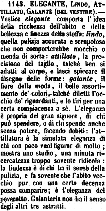 | Elegante, Galante - «Galante, parlando non di vestiti, non di sociale commercio di gentilezze e d'inezie o di seduzioni, ma di cose inanimate, è affinissimo ad elegante; forse non è che una corruzione di quello. Dicesi per lo più di lavori d'arte. Casa galantina, arnese galante; e ogni cosa bellina, dicesi che è una galanteria. Galante suppone per lo più piccolezza, piacevolezza, comodità che contenta ed appaga: l'eleganza sta pure con le grandi opere dell'arte, con le grandissime della natura». Tommaseo. [immagine] |