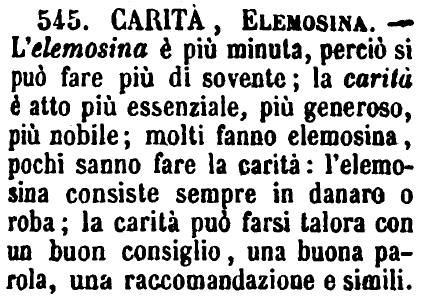 | Carità, Elemosina - L'elemosina è più minuta, perciò si può fare più di sovente; la carità è atto più essenziale, più generoso, più nobile; molti fanno elemosina, pochi sanno fare la carità: l'elemosina consiste sempre in danaro o roba; la carità può farsi talora con un buon consiglio, una buona parola, una raccomandazione e simili. [immagine] |
