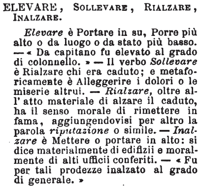 | Elevare, Sollevare, Rialzare, Inalzare - Elevare è Portare in su, Porre più alto o da luogo o da stato più basso. - « Da capitano fu elevato al grado di colonnello. » - Il verbo Sollevare è Rialzare chi era caduto; e metaforicamente è Alleggerire i dolori e le miserie altrui. - Rialzare, oltre all'atto materiale di alzare il caduto, ha il senso morale di rimettere in fama, aggiungendovisi per altro la parola riputazione o simile. - Inalzare è Mettere o portare in alto: si dice materialmente di edifizii e moralmente di alti ufficii conferiti. - « Fu per tali prodezze inalzato al grado di generale. » [immagine] |