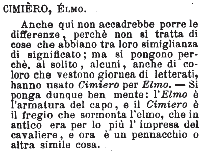 | Cimiero, Elmo - Anche qui non accadrebbe porre le differenze, perchè non si tratta di cose che abbiano tra loro simiglianza di significato; ma si pongono perchè, al solito, alcuni, anche di coloro che vestono giornea di letterati, hanno usato Cimiero per Elmo. - Si ponga dunque ben mente: l'Elmo è l'armatura del capo, e il Cimiero è il fregio che sormonta l'elmo, che in antico era per lo più l'impresa del cavaliere, e ora è un pennacchio o altra simile cosa. [immagine] |