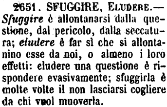 | Sfuggire, Eludere - Sfuggire è allontanarsi dalla questione, dal pericolo, dalla seccatura; eludere è far sì che si allontanino esse da noi, o almeno i loro effetti: eludere una questione è rispondere evasivamente; sfuggirla è molte volte il non lasciarsi cogliere da chi vuol muoverla. [immagine] |