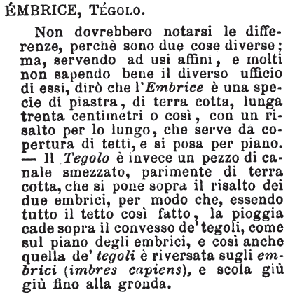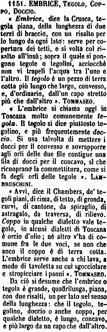 | Embrice, Tegolo, Coppo, Doccio - «Embrice, dice la Crusca, tegola piana, della lunghezza di due terzi di braccio, con un risalto per lo lungo da ogni lato: serve per copertura dei tetti, e si volta col risalto all'insù; sopra il quale si pongono tegole o tegolini, acciocchè non vi trapeli l'acqua tra l'uno e l'altro. Il tegolo è un pezzo di terra cotta più lungo che largo, convesso, e, d'ordinario, dall'un capo stretto più che dall'altro». Tommaseo.