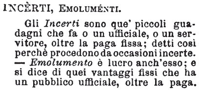 | Incerti, Emolumenti - Gli Incerti sono que' piccoli guadagni che fa o un ufficiale, o un servitore, oltre la paga fissa; detti così perchè procedono da occasioni incerte. - Emolumento è lucro anch'esso; e si dice di quei vantaggi fissi che ha un pubblico ufficiale, oltre la paga. [immagine] |