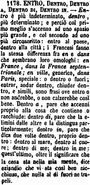 | Entro, Dentro, Dentro a, Dentro di, Dentro in - Entro è più indeterminato, dentro, più determinato; e perciò col primo meglio s'accenna ad uno spazio più grande, e col secondo ad uno più circoscritto: entro al paese, dentro alla città; i Francesi fanno la stessa differenza fra en e dans che sembrano loro omologhi: en France, dans la France septentrionale; en ville, generico, dans Paris, speciale: o dentro o fuori; entrar, andar dentro, chiuder dentro, e simili, sono frasi ove entro o non andrebbe, o non calzerebbe così bene. Dentro a, pare che accenni proprio alla cosa che contiene o racchiude: dentro di, pare che la elimini dalle altre e la distingua particolarmente; dentro in, pare che dica due volte dentro, proprio dentro: dentro al mare, dentro al cuore; dentro di me; dentro in me: quest'ultimo, oltre il significare che la cosa sta nella mia mente, dice eziandio che vi sta così ben racchiusa, che nulla al di fuori ne trapeli. [immagine] |