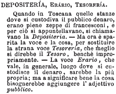 | Depositeria, Erario, Tesoreria - Quando in Toscana quelle stanze dove si custodiva il pubblico denaro, erano piene zeppe di francesconi, e per ciò si appuntellavano, si chiamavano la Depositeria. - Ma ora è sparita la voce e la cosa, per sostituire la strana voce Tesoreria, che meglio si direbbe il Tesoro, benché impropriamente. - La voce Erario, che vale, in generale, luogo dove si custodisce il denaro, sarebbe la più propria; ma a significare bene la cosa bisognerebbe aggiungere l’adjettivo pubblico. [immagine] |