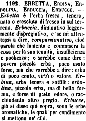 | Erbetta, Erbina, Erbolina, Erbuccia, Erbucce - Erbetta è l'erba fresca, tenera, nata o cresciuta di fresco in sul terreno. Erbuccia, diminutivo leggermente dispregiativo, e se mi attentassi a dire, compassionativo, cioè parola che lamenta e commisera la cosa per la sua tenuità, insufficienza e pochezza; e sarebbe come dire: povera piccola erba, poco usato forse, ma che varrebbe a dire: erba di poco conto, virtù o valore. Erbina, erba tenera e sottile: erbolina, piccola erba, ma di bella forma, e forse di grato odore, o racchiudente altro pregio. Erbucce, già si disse qui sopra, sono le erbe aromatiche, le quali per condimento si mettono ne' cibi. [immagine] |