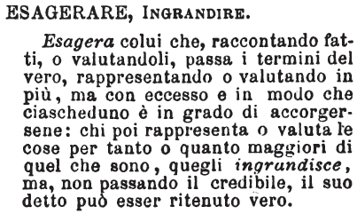 | Esagerare, Ingrandire - Esagera colui che, raccontando fatti, o valutandoli, passa i termini del vero, rappresentando o valutando in più, ma con eccesso e in modo che ciascheduno è in grado di accorgersene: chi poi rappresenta o valuta le cose per tanto o quanto maggiori di quel che sono, quegli ingrandisce, ma, non passando il credibile, il suo detto può esser ritenuto vero. [immagine] |