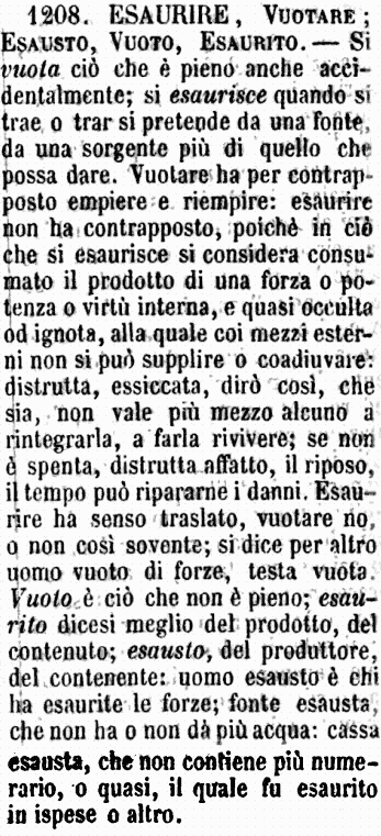 | Esaurire, Vuotare; Esausto, Vuoto, Esaurito - Si vuota ciò che è pieno anche accidentalmente; si esaurisce quando si trae o trar si pretende da una fonte, da una sorgente più di quello che possa dare. Vuotare ha per contrapposto empiere e riempire: esaurire non ha contrapposto, poichè in ciò che si esaurisce si considera consumato il prodotto di una forza o potenza o virtù interna, e quasi occulta od ignota, alla quale coi mezzi esterni non si può supplire o coadiuvare: distrutta, essiccata, dirò così, che sia, non vale più mezzo alcuno a rintegrarla, a farla rivivere; se non è spenta, distrutta affatto, il riposo, il tempo può ripararne i danni. Esaurire ha senso traslato, vuotare no, o non così sovente; si dice per altro uomo vuoto di forze, testa vuota. Vuoto è ciò che non è pieno; esaurito dicesi meglio del prodotto, del contenuto; esausto, del produttore, del contenente: uomo esausto è chi ha esaurite le forze; fonte esausta, che non ha o non dà più acqua: cassa esausta, che non contiene più numerario, o quasi, il quale fu esaurito in ispese o altro. [immagine] |