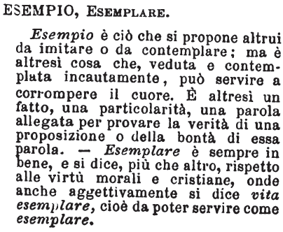 | Esempio, Esemplare - Esempio è ciò che si propone altrui da imitare o da contemplare; ma è altresì cosa che, veduta e contemplata incautamente, può servire a corrompere il cuore. E' altresì un fatto, una particolarità, una parola allegata per provare la verità di una proposizione o della bontà di essa parola. - Esemplare è sempre in bene, e si dice, più che altro, rispetto alle virtù morali e cristiane, onde anche aggettivamente si dice vita esemplare, cioè da poter servire come esemplare. [immagine] |