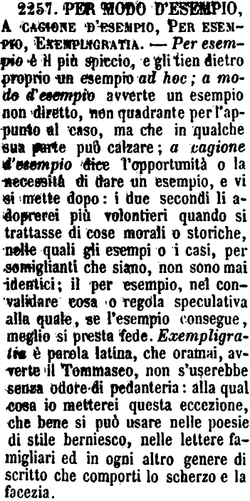 | Esempligrazia, Per esempio, A mo’ d’esempio, Per atto d’esempio - Esempligrazia è la frase latina Exempli gratia, travestita; ma ora sarebbe pedanteria l'usarla, e si usa solo Per esempio, quando vogliamo confermar con l'esempio una cosa. - Gli altri due modi suonano lo stesso, salvo che A mo' d'esempio è più efficace ed è familiare. - Per atto d'esempio ha la stessa efficacia, ma pizzica un poco del pedantesco. [immagine] |