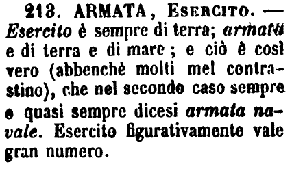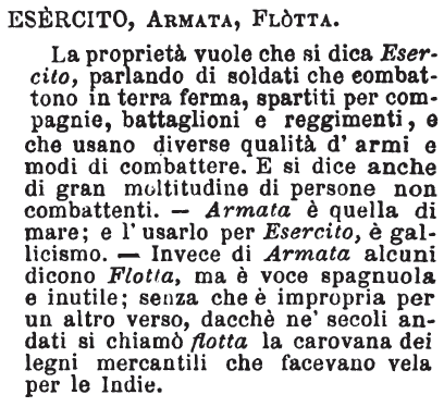 | Esercito, Armata, Flotta - La proprietà vuole che si dica Esercito, parlando di soldati che combattono in terra ferma, spartiti per compagnie, battaglioni e reggimenti, e che usano diverse qualità d'armi e modi di combattere. E si dice anche di gran moltitudine di persone non combattenti. - Armata è quella di mare; e l'usarlo per Esercito, è gallicismo. - Invece di Armata alcuni dicono Flotta, ma è voce spagnuola e inutile; senza che è impropria per un altro verso, dacchè ne' secoli andati si chiamò flotta la carovana dei legni mercantili che facevano vela per le Indie. [immagine] |