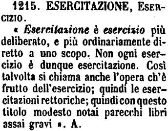 | Esercitazione, Esercizio - «Esercitazione è esercizio più deliberato, e più ordinariamente diretto a uno scopo. Non ogni esercizio è dunque esercitazione. Così talvolta si chiama anche l'opera ch'è frutto dell'esercizio; quindi le esercitazioni rettoriche; quindi con questo titolo modesto notai parecchi libri assai gravi». A. [immagine] |