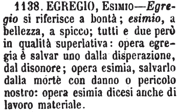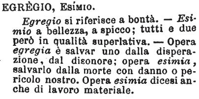 | Egregio, Esimio - Egregio si riferisce a bontà; esimio, a bellezza, a spicco; tutti e due però in qualità superlativa: opera egregia è salvar uno dalla disperazione, dal disonore; opera esimia, salvarlo dalla morte con danno o pericolo nostro: opera esimia dicesi anche di lavoro materiale. [immagine] |