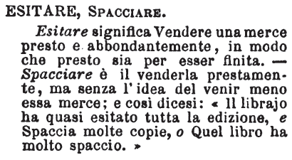 | Esitare, Spacciare - Esitare significa Vendere una merce presto e abbondantemente, in modo che presto sia per esser finita. - Spacciare è il venderla prestamente, ma senza l'idea del venir meno essa merce; e così dicesi: «Il librajo ha quasi esitato tutta la edizione, e Spaccia molte copie, o Quel libro ha molto spaccio.» [immagine] |