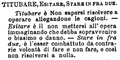 | Titubare, Esitare, Stare in fra due - Titubare è non sapersi risolvere a operare allegandone le cagioni. - Esitare è il non mettersi all'opera immaginando che debba sopravvenire o biasimo o danno. - Stare in fra due, è l'esser combattuto da contrarie volontà di fare e non fare, e così non risolversi a nulla. [immagine] |