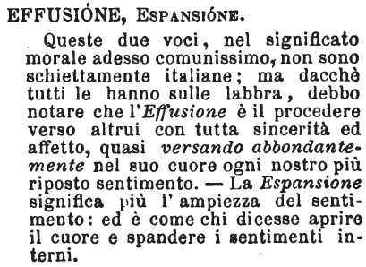 | Effusione, Espansione - Queste due voci, nel significato morale adesso comunissimo, non sono schiettamente italiane; ma dacchè tutti le hanno sulle labbra, debbo notare che l'Effusione è il procedere verso altrui con tutta sincerità ed affetto, quasi versando abbondantemente nel suo cuore ogni nostro più riposto sentimento. - La Espansione significa più l'ampiezza del sentimento: ed è come chi dicesse aprire il cuore e spandere i sentimenti interni. [immagine] |