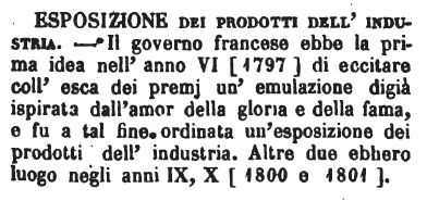 | Esposizione dei prodotti dell’industria - Il governo francese ebbe la prima idea nell'anno VI [1797] di eccitare coll'esca dei premj un'emulazione digià ispirata dall'amor della gloria e della fama, e fu a tal fine ordinata un'esposizione dei prodotti dell'industria. Altre due ebbero luogo negli ani IX, X [1800 e 1801]. [immagine] |