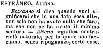 | Estraneo, Alieno - Estraneo si dice quando vuol significarsi che in una data cosa altri, non solo non ha avuto nulla che fare, ma che non ne ha avuto il minimo sentore. - Alieno significa contrarietà naturale, per la quale non facciamo, senza ripugnanza, certe cose. [immagine] |