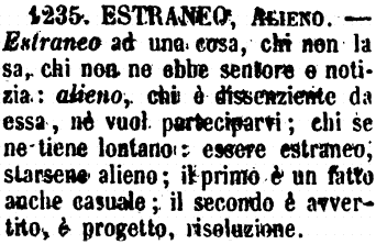 | Estraneo, Alieno - Estraneo ad una cosa, chi non la sa, chi non ne ebbe sentore e notizia: alieno, chi è dissenziente da essa, nè vuol parteciparvi; chi se ne tiene lontano: essere estraneo, starsene alieno; il primo è un fatto anche casuale; il secondo è avvertito, è progetto, risoluzione. [immagine] |
