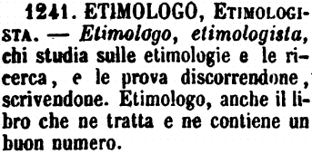 | Etimologo, Etimologista - Etimologo, etimologista, chi studia sulle etimologie e le ricerca, e le prova discorrendone, scrivendone. Etimologo, anche il libro che ne tratta e ne contiene un buon numero. [immagine] |