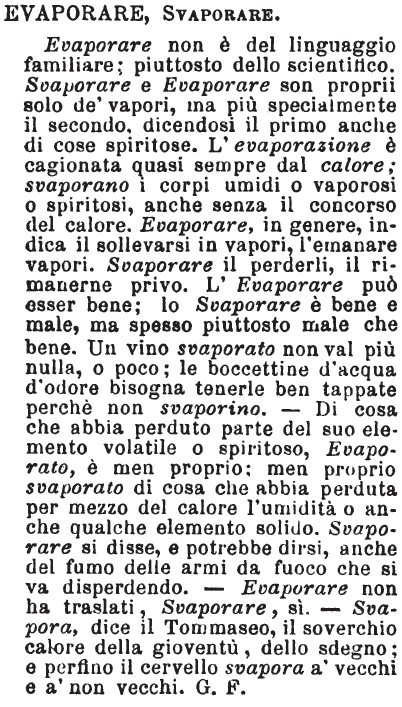 | Evaporare, Svaporare - Evaporare non è del linguaggio familiare; piuttosto dello scientifico. Svaporare e Evaporare son proprii solo de' vapori, ma più specialmente il secondo, dicendosi il primo anche di cose spiritose. L'evaporazione è cagionata quasi sempre dal calore; svaporano i corpi umidi o vaporosi o spiritosi, anche senza il concorso del calore. Evaporare, in genere, indica il sollevarsi in vapori, l'emanare vapori. Svaporare il perderli, il rimanerne privo. L'Evaporare può esser bene; lo Svaporare è bene e male, ma spesso piuttosto male che bene. Un vino svaporato non val più nulla, o poco; le boccettine d'acqua d'odore bisogna tenerle ben tappate perchè non svaporino. - Di cosa che abbia perduto parte del suo elemento volatile o spiritoso, Evaporato, è men proprio; men proprio svaporato di cosa che abbia perduta per mezzo del calore l'umidità o anche qualche elemento solido. Svaporare si disse, e potrebbe dirsi, anche del fumo delle armi da fuoco che si va disperdendo. - Evaporare non ha traslati, Svaporare, si. - Svapora, dice il Tommaseo, il soverchio calore della gioventù, dello sdegno; e perfino il cervello svapora a' vecchi e a' non vecchi. G. F. [immagine] |
